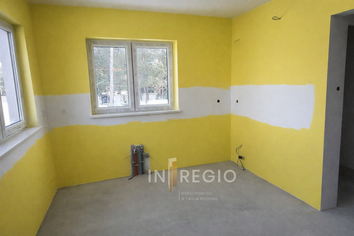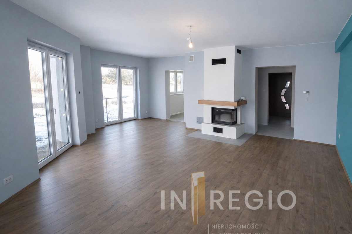 Dom jest w stanie częściowego wykończenia, co umożliwia dopasowanie wnętrz do własnego stylu i potrzeb. Na parterze wykonano wylewki betonowe, a ściany na obu kondygnacjach wykończono gładziami gipsowymi. Parter został pomalowany, a podłogi przygotowano pod montaż paneli przystosowanych do ogrzewania podłogowego. W salonie zamontowano narożny kominek, który stanowi zarówno element funkcjonalny, jak i estetyczny.