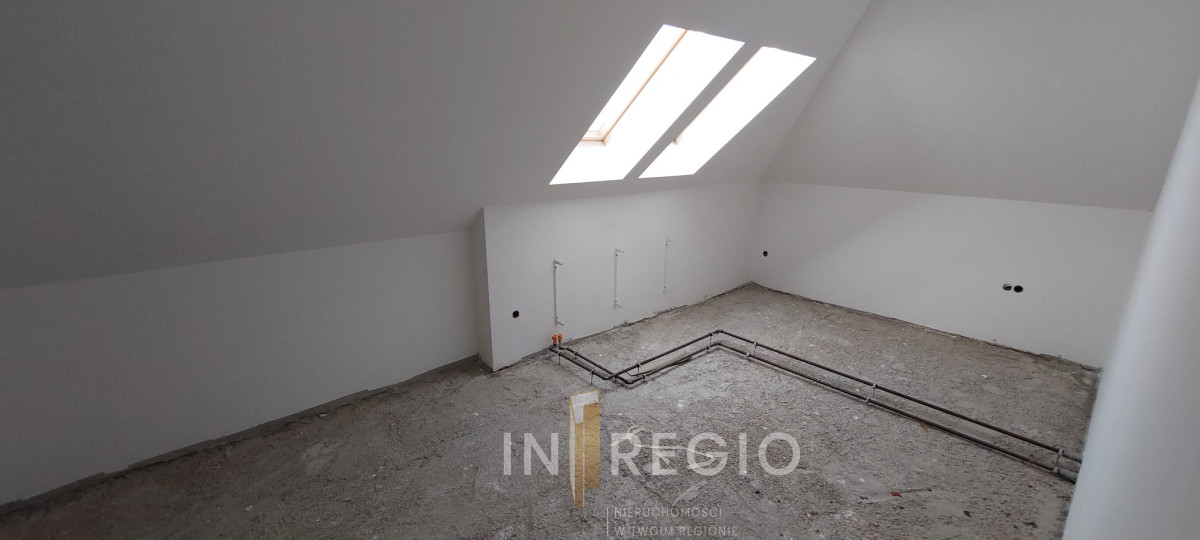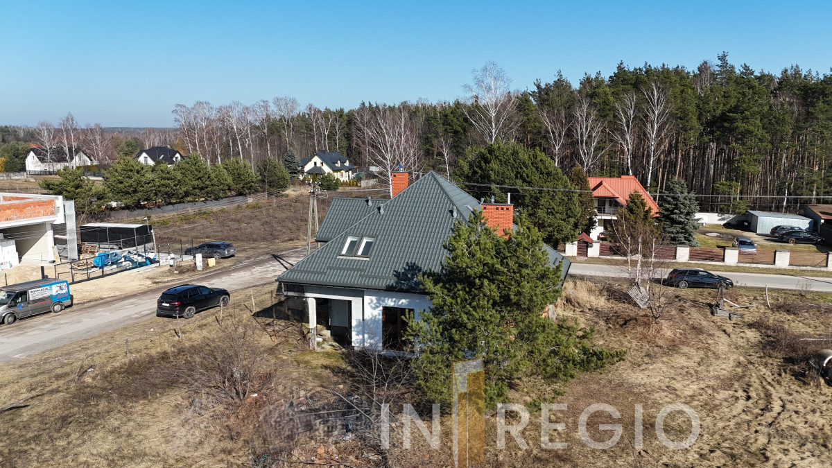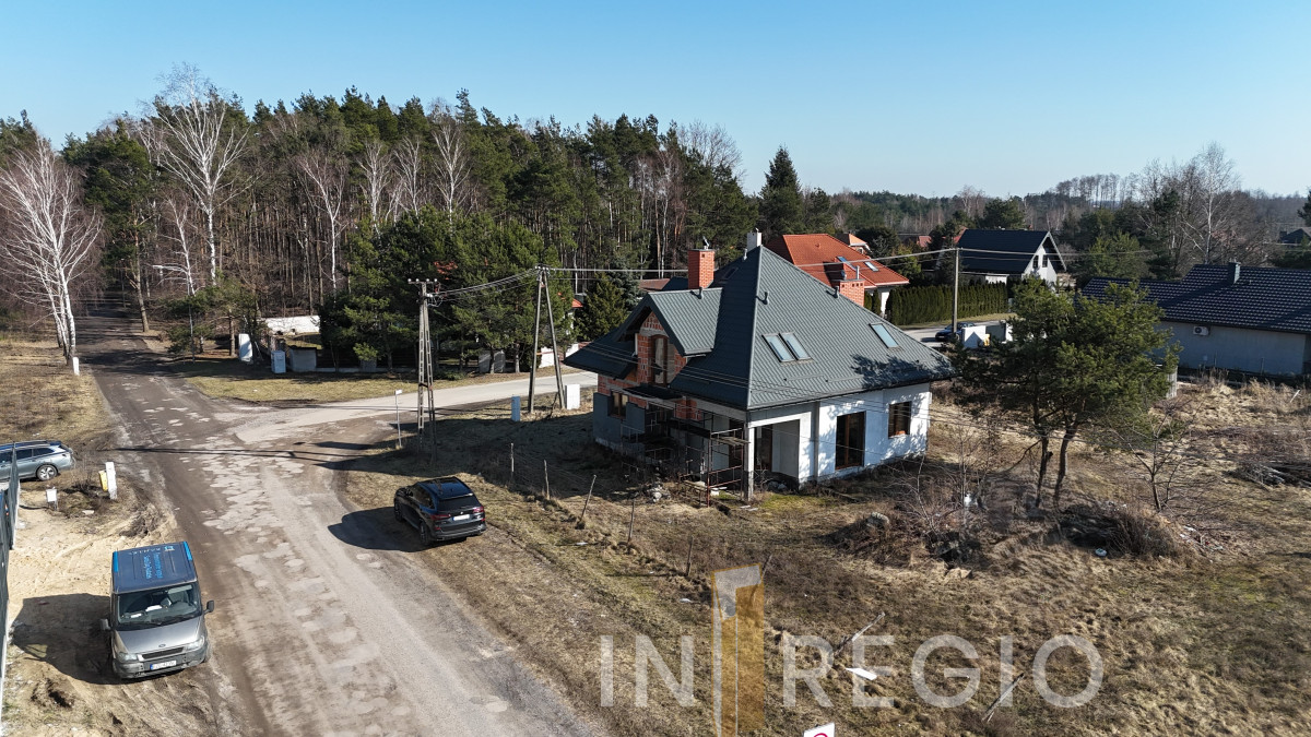 Elewacja jest częściowo wykończona — fragmenty ścian zostały ocieplone i przygotowane pod finalną warstwę tynku, natomiast pozostała część pozostaje do wykończenia, co pozwala przyszłemu właścicielowi dopasować kolorystykę do własnych preferencji. Stolarka okienna w ciepłym odcieniu drewna harmonijnie komponuje się z bryłą budynku i podkreśla jego przytulny charakter.