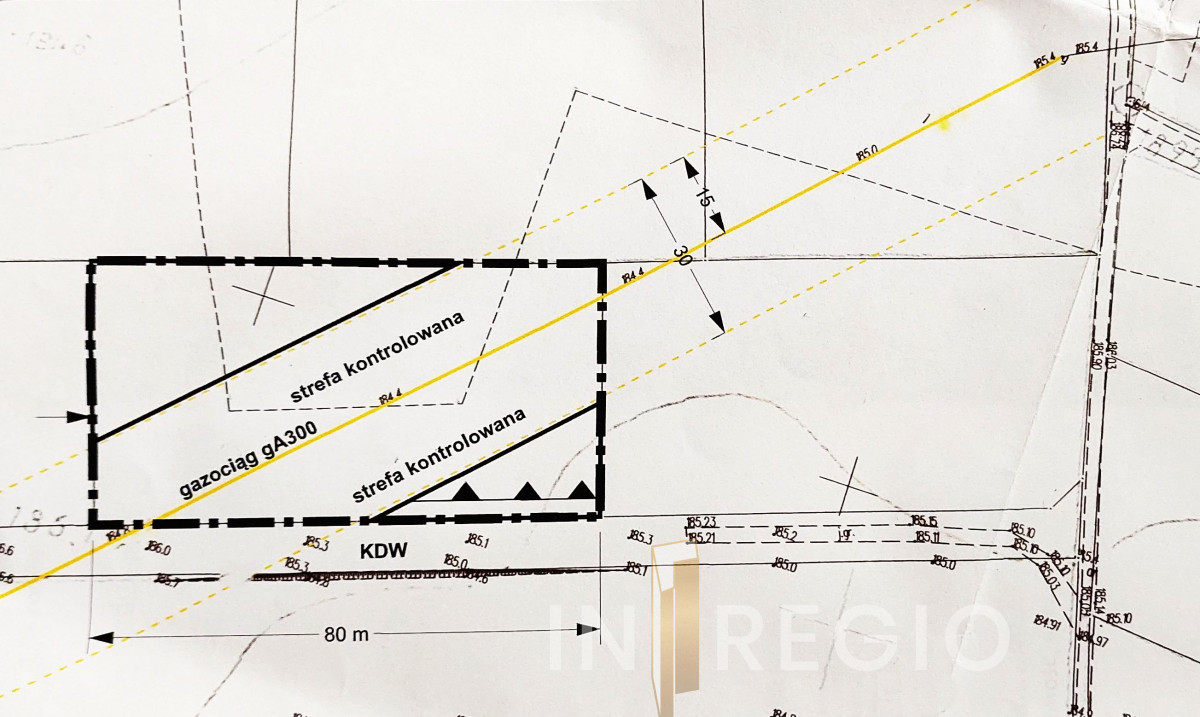 Działka niezabudowana o przybliżonych wymiarach 80 m (szerokość frontu) na 41 m (głębokość).