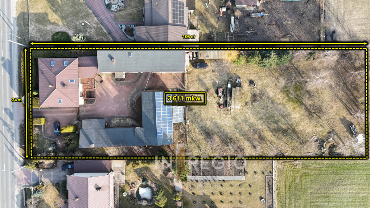 - Powierzchnia działki: 3611 m² (ok. 106 m x 34 m)